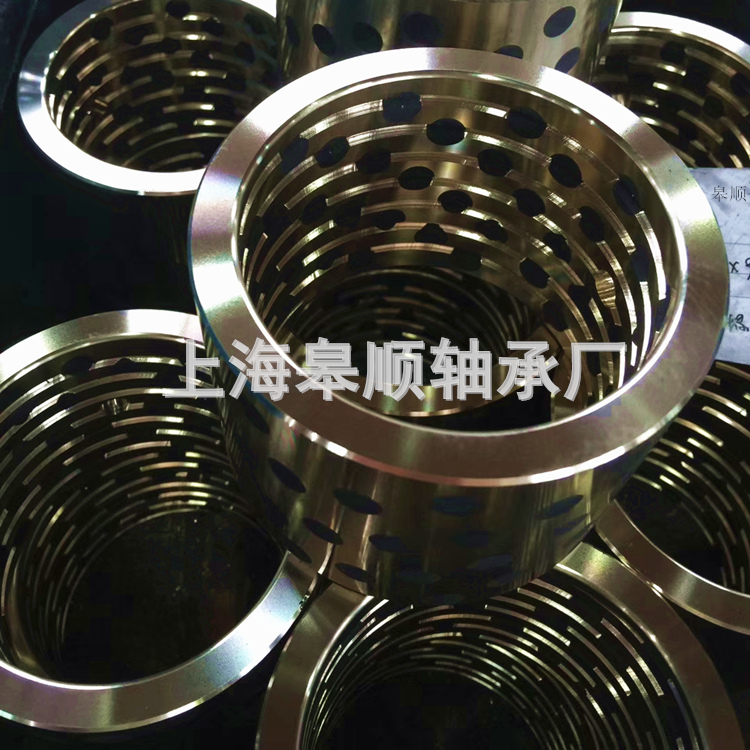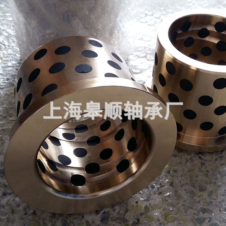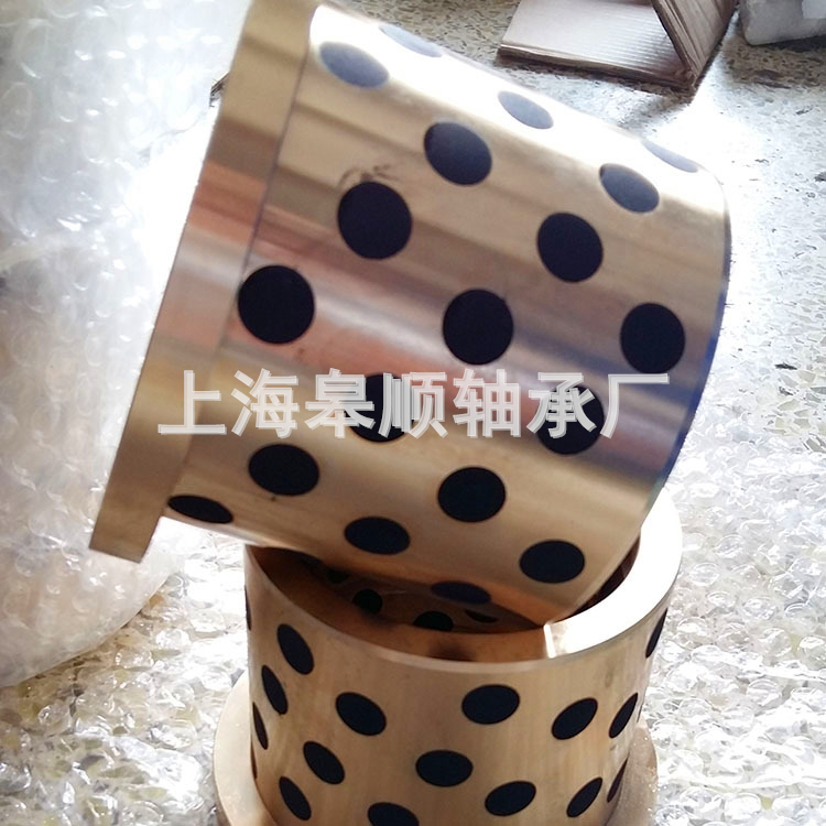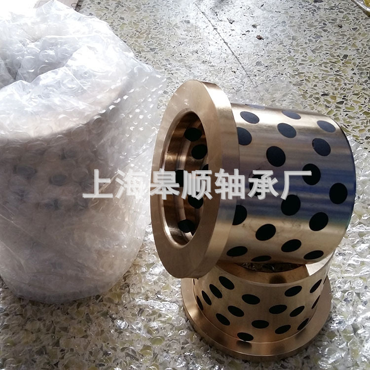 JFB非标翻边石墨铜套简介:固体镶嵌轴承是在高力黄铜基体上镶嵌固体润滑剂的一种新产品。一般固体润滑剂占摩擦表面积的20-30%,石墨铜套自润滑轴承的润滑原理是在轴与轴承的滑动摩擦过程中,石墨颗粒的一部分转移到轴与轴承的摩擦表面上,形成了一层较稳定的固体润滑隔膜,防止轴与轴承的直接粘着磨损。这种合理性的结合综合了金属合金与非金属减磨材料的各自性能优点,进行互补,即有了金属的高承载能力,又得到了减磨材料的润滑性能。所以特别适用于不加油、少加油、高温、高负载或水中等环境中。它突破了一般轴承依靠油膜润滑的局限性.适用于高温.高载,耐腐蚀或无法加油等场合条件下使用。它的硬度比一般铜套高,耐磨性能也好。该产品以特殊配方的高力黄铜为基体有很高的力学性能、铸造性能良好、耐蚀性较好,表面按一定的角度和密度镶嵌特殊配方的固体润滑剂,经精密加工而成。目前,该产品广泛冶金连铸机,轧钢设备,矿山机械,船舶,汽轮机,注塑机以及生产流水线中。
